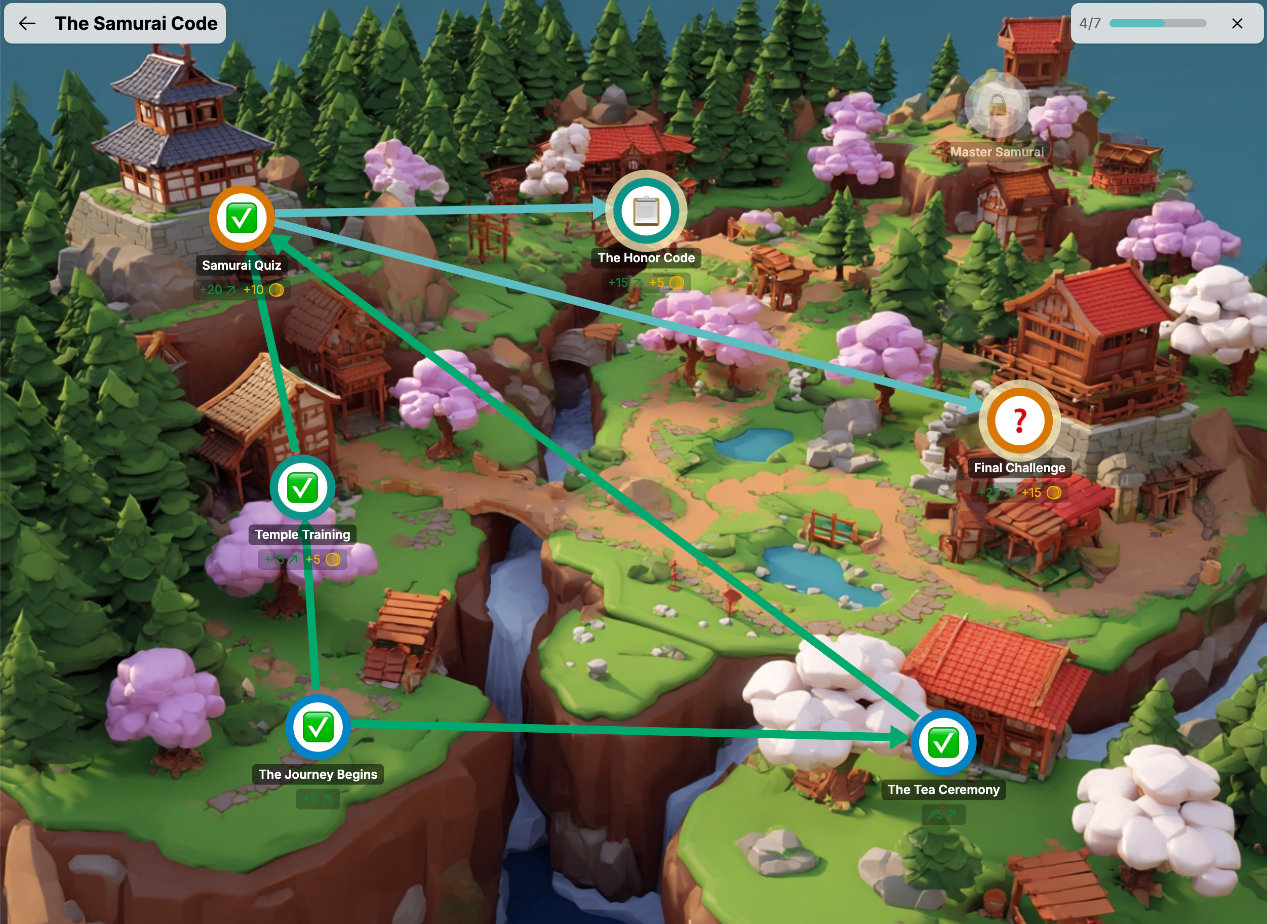 Stiene mellom målene viser deg hvilke du må fullføre før de neste låses opp. Noen ganger forgrener stiene seg — det betyr at du har flere alternativer å arbeide med samtidig. Andre ganger møtes stiene — det betyr at du må fullføre flere mål før det neste låses opp.